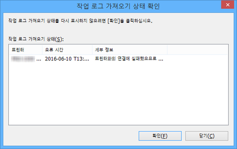 작업 로그 가져오기 상태 확인 대화 상자