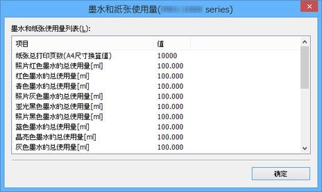 可以在墨水和纸张使用量对话框中查看此打印机目前为止的墨水和纸张使用量。