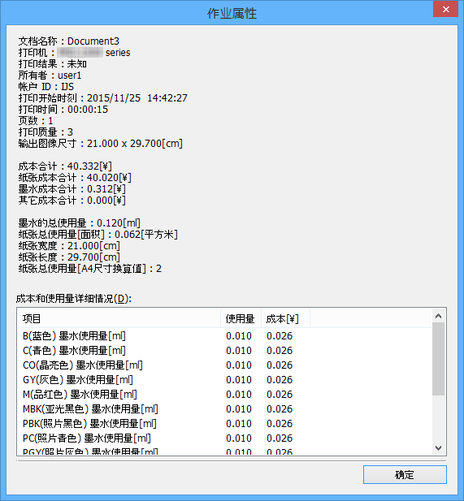 显示成本以及每种颜色墨水和每种介质类型的总使用量。