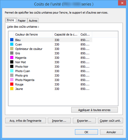 Le coût de l'unité et la capacité du réservoir de l'encre sélectionnés sont appliqués à toutes les couleurs d'encre.