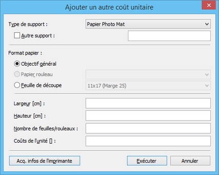 Définissez le Type de support, le Format papier et les Coûts de l'unité.