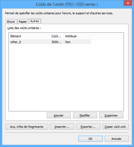 Définissez les coûts autres que ceux de l'encre et du papier sur la page Autres.