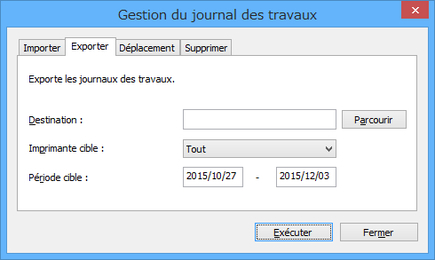 Vous pouvez exporter et importer les journaux de travaux récupérés sous forme de fichier. Ce fichier peut être utilisé si vous remplacez l'ordinateur utilisé pour la gestion, modifiez la destination des journaux de travaux ou augmentez la capacité du disque dur.