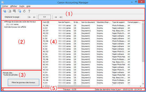 Acquiert les journaux de travaux les plus récents pour les imprimantes spécifiées dans les critères d'extraction pour mettre à jour la liste Coût du travail.