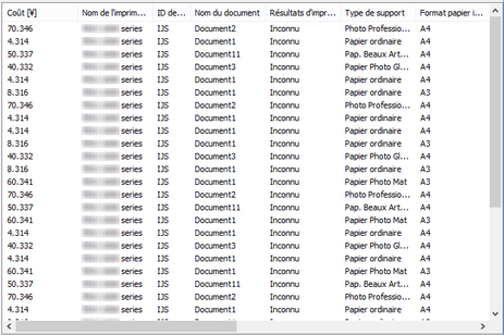 Les éléments comprenant le Coût, l'ID de compte, le Nom du document, les Résultats d'impression, le Type de support et le Papier consommé s'affichent.