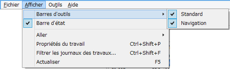 Les Barres d'outils incluent la Barre d'outils Standard et la Barre d'outils de Navigation, et vous pouvez afficher et masquer chacune d'elle.