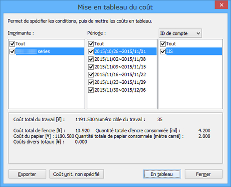 Extrait les journaux de travaux, calcule les coûts et affiche les résultats de mise en tableau une fois l'acquisition des journaux de travaux depuis toutes les imprimantes cibles terminée.