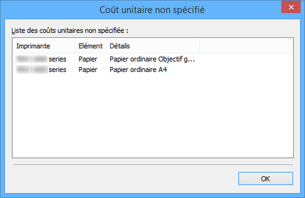 La liste de coûts de l'unité non spécifiés s'affiche dans la Boîte de dialogue Coût unitaire non spécifié.