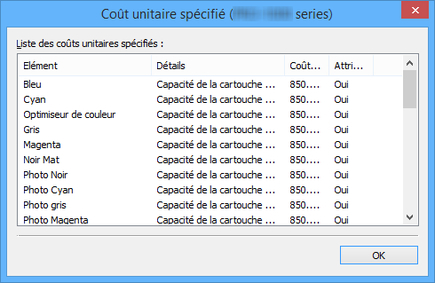 Vous pouvez vérifier une liste de coûts de l'unité définis pour cette imprimante dans la boîte de dialogue Coût unitaire spécifié.