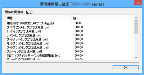 累積使用量の確認]ダイアログボックスでは、そのプリンターがそれまでに消費したインクと用紙の累積使用量を確認できます。