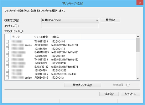 検索されたプリンターのアドレス情報(接続先)を表示します。