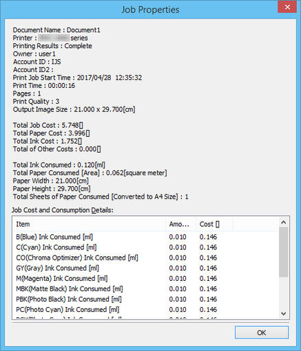 Os custos totais de tinta dos trabalhos de destino são exibidos.