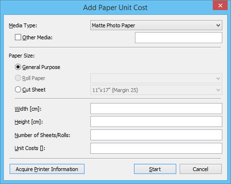 Para definir um custo de unidade de um papel não exibido em Tipo de mídia (Media Type), selecione Outras mídias e insira o ID de papel.