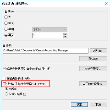 在成本数据的定期导出对话框中选择通过电子邮件发送导出的文件。