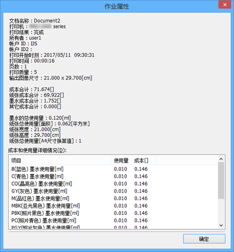显示目标作业的墨水成本合计。