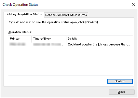 Eine Liste der Fehler, die beim Erfassen der Job-Protokolle aufgetreten sind, wird auf der Registerkarte Erfassungsstatus der Job-Protokolle (Job Log Acquisition Status) angezeigt.