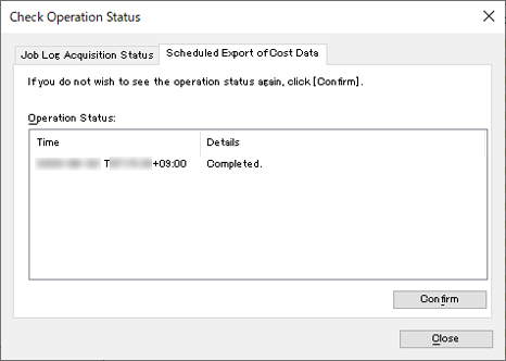 Der Betriebsstatus der geplanten Exporte und E-Mail-Übertragungen von Kostendaten für den Druckauftrag werden auf dem Blatt Geplanter Export der Kostendaten (Scheduled Export of Cost Data) angezeigt.