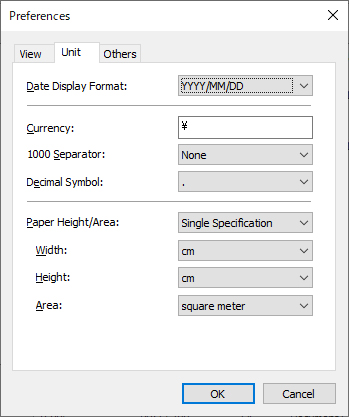 Das Dialogfeld besteht aus folgenden Blättern: Anzeigen (View), Einheit (Unit) und Andere (Others).
