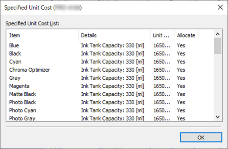 Можно отобразить список стоимости единицы, указанной для выбранного принтера, в диалоговом окне Указанная стоимость единицы (Specified Unit Cost).