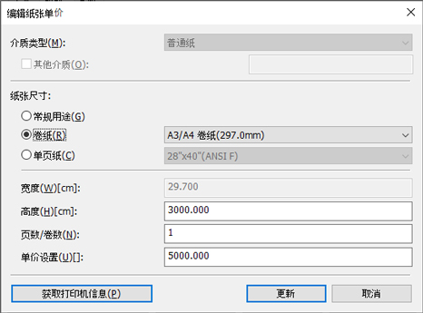 设置介质类型、纸张尺寸和单价设置。