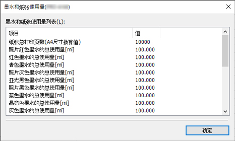 可以在墨水和纸张使用量对话框中查看此打印机目前为止的墨水和纸张使用量。