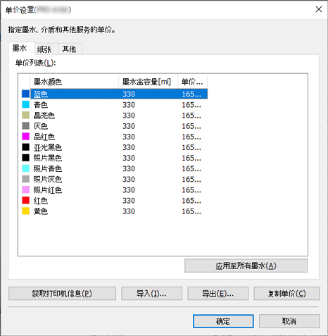 将当前在墨水颜色中选择的单价设置和墨水盒容量应用至单价列表中显示的所有墨水颜色。