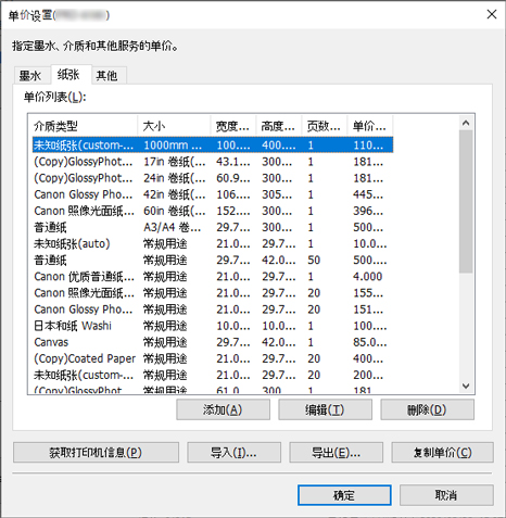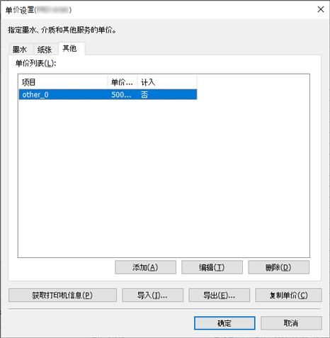 在单价设置对话框中设置用于计算作业成本的单价。 设置墨水、纸张以及除墨水和纸张以外的项目单价。
