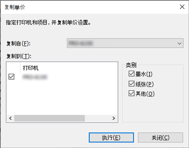 如果复制单价,从中复制的打印机上的单价设置将覆盖复制到的打印机上的所有单价设置。