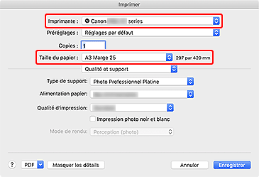 Définissez l'Imprimante (Printer)et le Format papier (Paper Size).