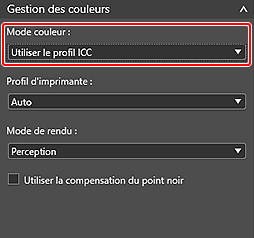 Dans Gestion des couleurs, sélectionnez Utiliser le profil ICC pour le Mode couleur.