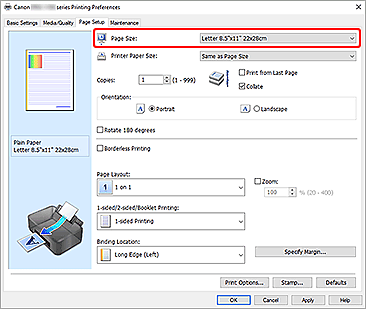Nella finestra di dialogo Proprietà, fare clic sulla scheda Imposta pagina (Page Setup), quindi selezionare Formato pagina (Page Size).