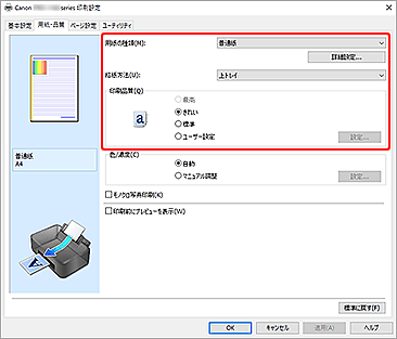[用紙・品質]タブをクリックし、[用紙の種類]、[給紙方法]および[印刷品質]を設定する