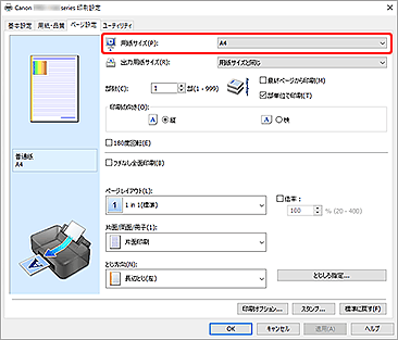 プロパティダイアログボックスの[ページ設定]タブをクリックし、[用紙サイズ]を選ぶ