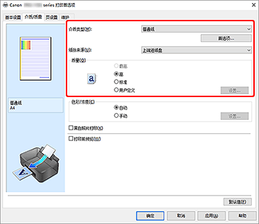 单击介质/质量选项卡,然后设置介质类型,纸张来源和质量。