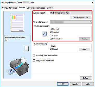 Cliquez sur l'onglet Principal, puis définissez le Type de support, l'Alimentation papier et la Qualité d'impression.
