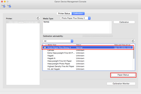From the printer list, select the printer for which you want to check the advisability of executing color calibration.