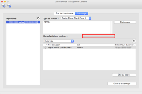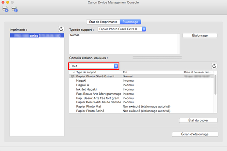 Vous pouvez vérifier l'état d'étalonnage des couleurs pour le papier sélectionné.