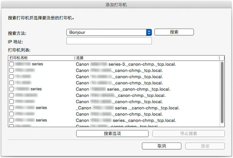 显示通过网络连接的打印机的Bonjour名称或IP地址,以及通过USB连接的打印机的连接端口名称。
