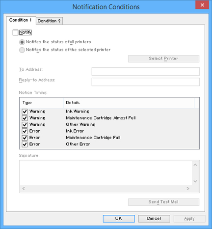 Select Notification Settings > Notification Conditions on File menu to display Notification Conditions dialog box.