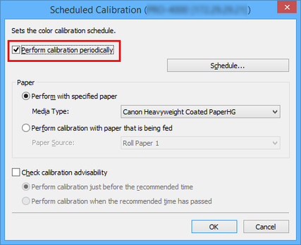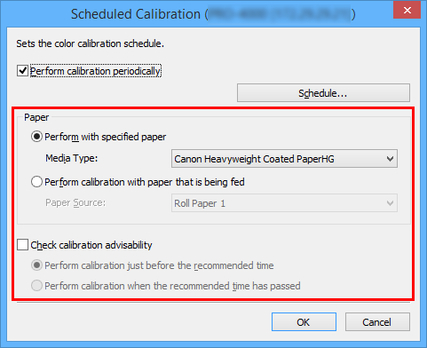 To manage color for multiple media types, select Roll Paper 1 + Roll Paper 2 in Paper Source in the Scheduled Calibration dialog box.