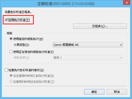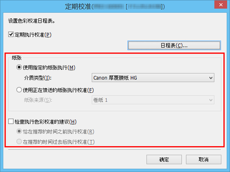 要管理多个介质类型的色彩,请在定期校准对话框的纸张来源中选择卷纸 1 + 卷纸 2。