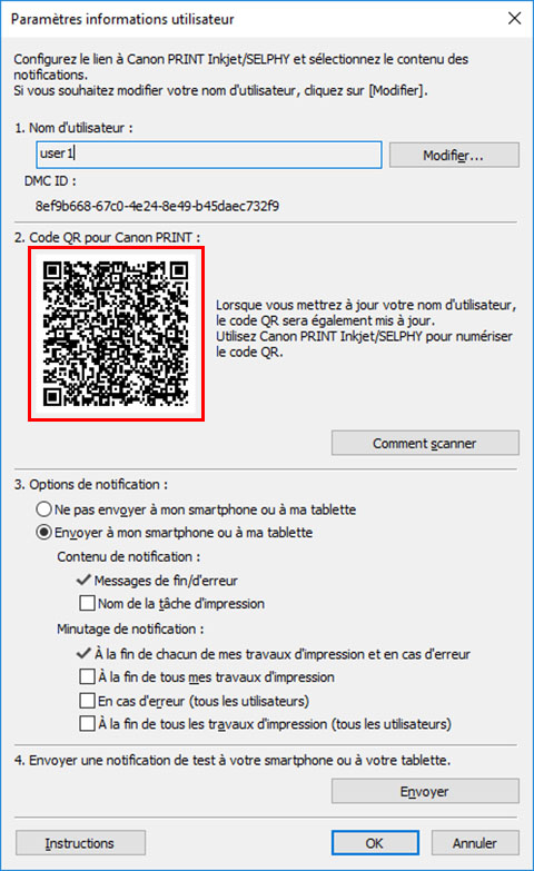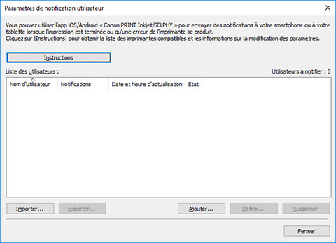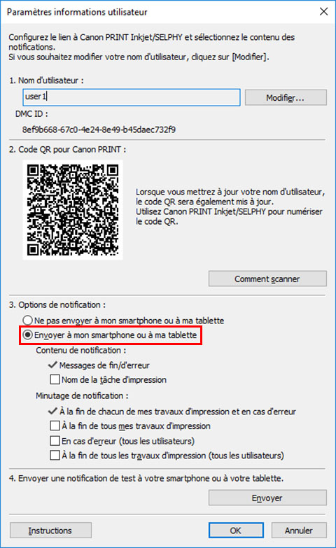 Remarque- Cliquez sur le bouton Instructions pour afficher "Envoi d'une notification de l'état d'une tâche d'impression à un smartphone ou une tablette PC".