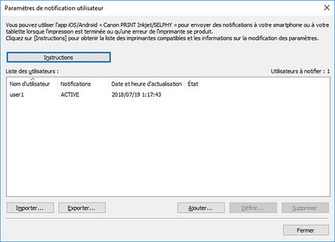 (Fermer) pour fermer la boîte de dialogue Paramètres informations utilisateur, et le smartphone ne reçoit aucune notification concernant les tâches d'impression terminées ou arrêtées.