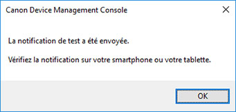 Quand le message envoyé dans la notification test s'affiche, vérifiez que les "Paramètres de notification ont été activés" sur le smartphone, puis cliquez sur le bouton OK.