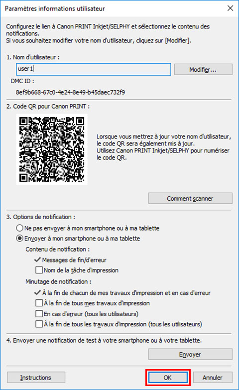 Tandis que la boîte de dialogue Paramètres informations utilisateur est ouverte, accédez à la procédure d'"Enregistrement de smartphones à l'aide de Canon PRINT Inkjet/SELPHY." Enregistrez un smartphone dans le serveur de notifications.
