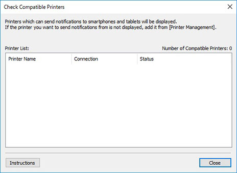 Per aprire la finestra di dialogo Verifica stampanti compatibili, selezionare Notifiche smartphone/tablet, quindi Verifica stampanti compatibili dal menu File.