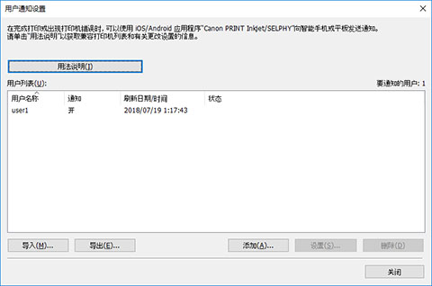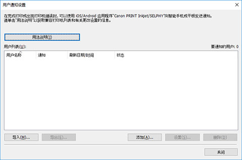 (关闭)按钮关闭用户信息设置对话框,则设置未完成,并且智能手机不会收到有关打印作业完成或停止的通知。