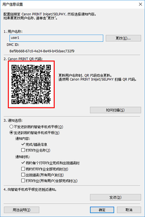 扫描Device Management Console的用户信息设置对话框中显示的Canon PRINT QR 代码。