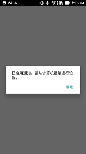 出现“已启用通知。请从计算机继续进行设置。”信息时,点击确定。
