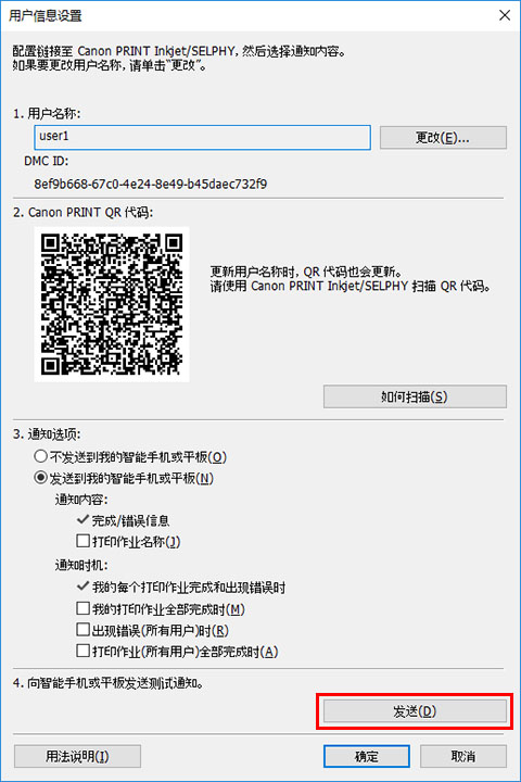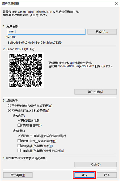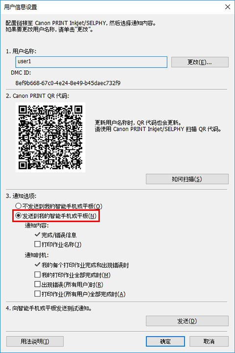 用户信息设置对话框打开时,请转至“使用Canon PRINT Inkjet/SELPHY注册智能手机”的步骤。 将智能手机注册到通知服务器。